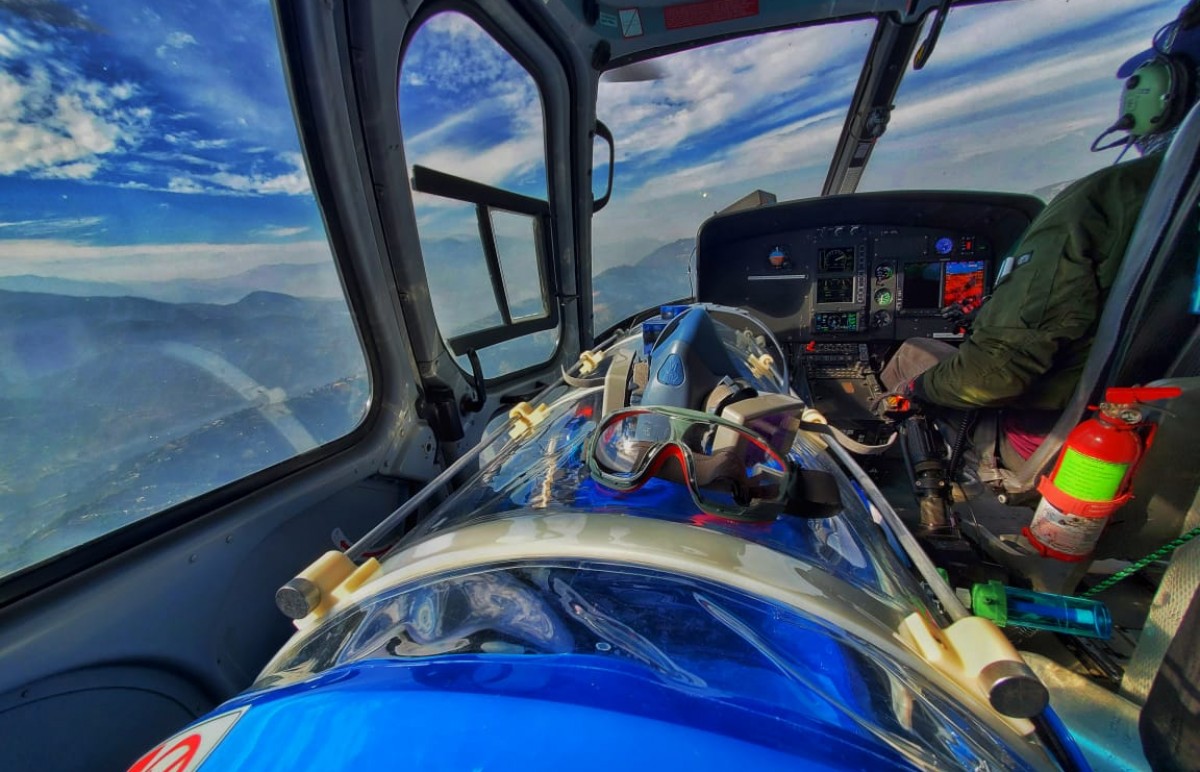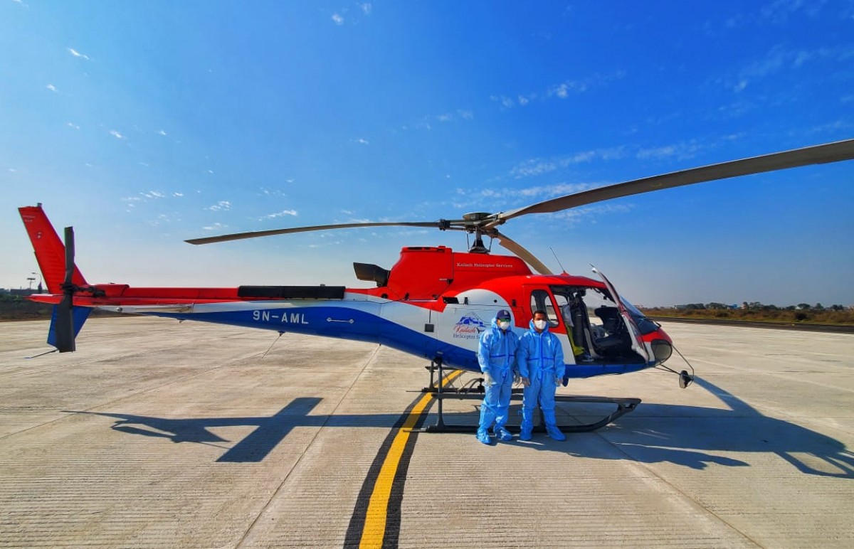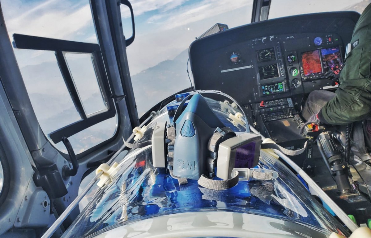 Patient was a recently diagnosed COVID case with multiple underlying co-morbidities. Patient was diagnosed with radiographic moderate severity illness, and was under oxygen via face mask. The 2 hour flight from Kathmandu to Bheri Zonal Hospital Nepalgunj had a stopover at the Nepalgunj Airport for refueling. The trip back with the patient on-board was fortunately uneventful and the patient was successfully handed over to the medical team at Star Hospital.